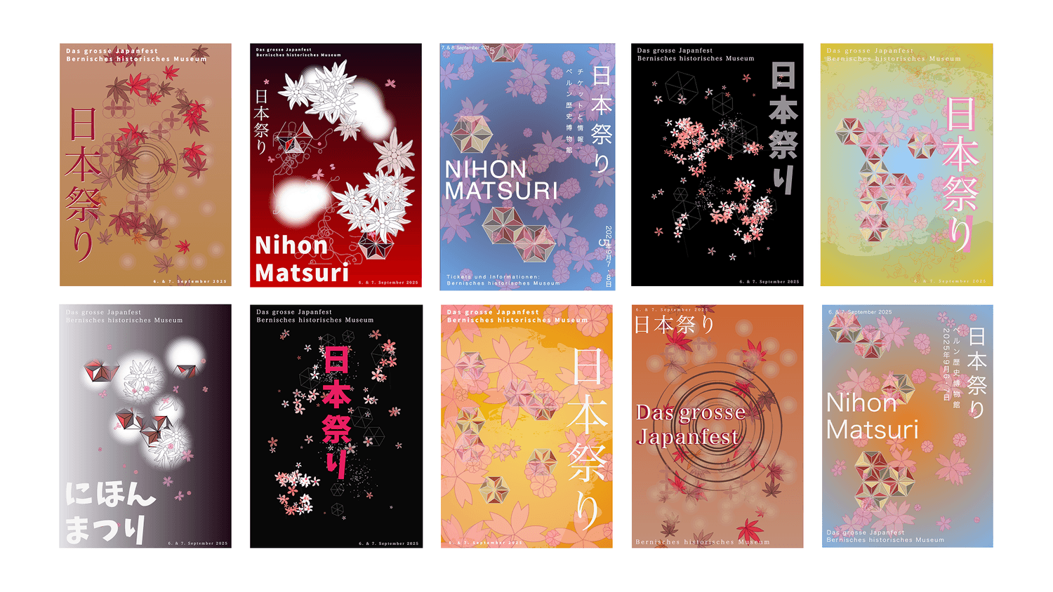 For this project, I coded a generative design system creating dynamic poster variations for the Nihon Matsuri in Bern. The generator automatically produces unique compositions combining traditional Japanese elements—sakura motifs, geometric patterns, and seasonal imagery—while maintaining consistent brand identity across different color palettes.